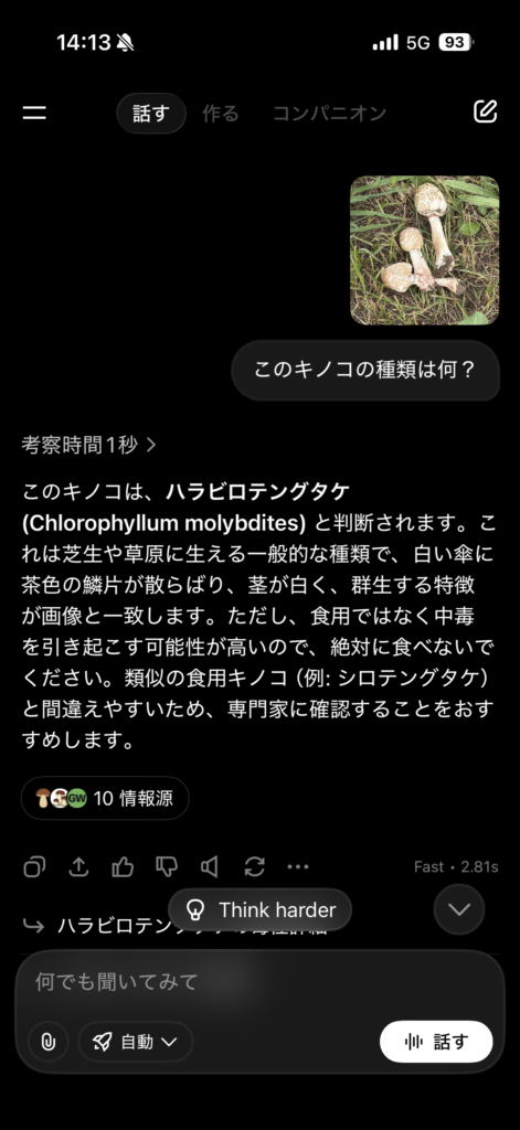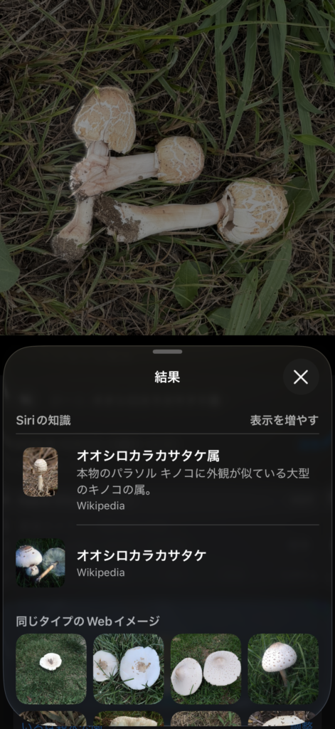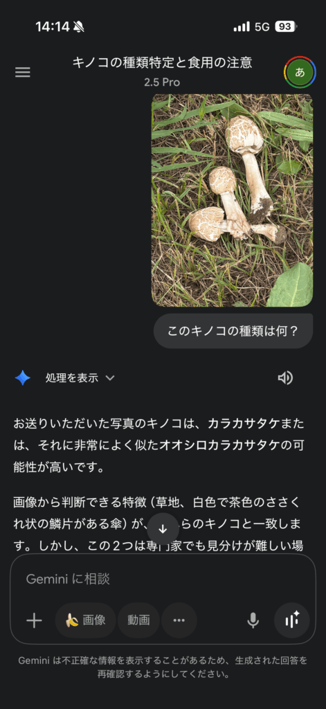 なんというキノコなのか皆目わからなかったので、AIに聞いてみました。最近のAIは画像を渡すとそれを解析してくれたりもします
