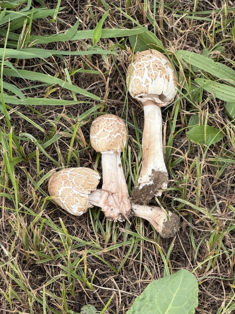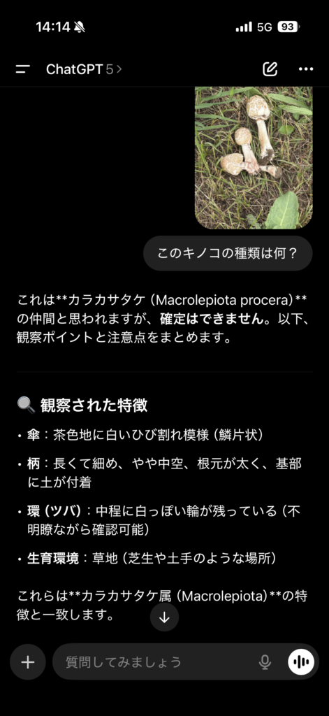 Grok以外では3者がカラカサタケまたはオオシロカラカサタケという回答でしたので、とりあえずこれが有力と言えそう?なお、カラカサタケとオオシロカラカサタケはそっくりで、前者は可食だが後者は毒ありらしいので、間違ってもたべてみたりしては危険です