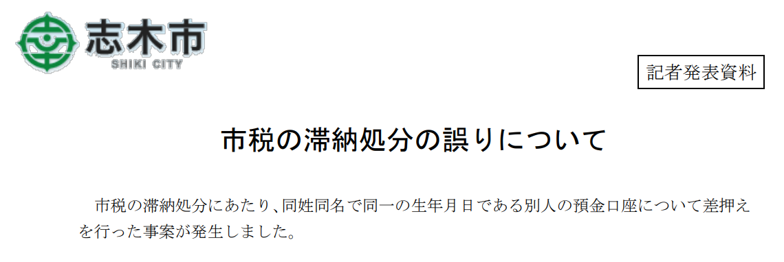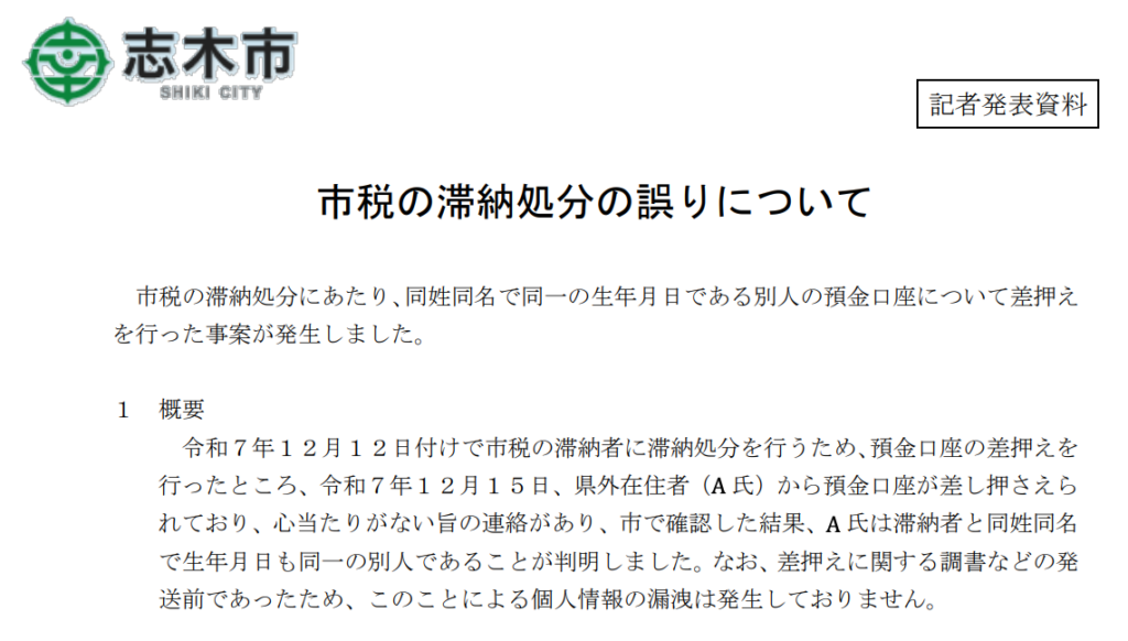 令和7年12月16日、志木市は以下の記者発表を行いました。市税滞納者の預金口座差し押さえのつもりが同姓同名・同生年月日の別人の預金口座を差し押さえてしまったという不祥事です