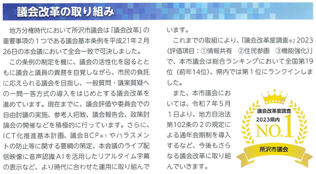 下記は所沢市議会発行の『所沢市議会のしおり』の抜粋で、議会改革の実績がまとめられていますが、開かれた議会づくりのために多様な取り組みがおこなわれていることがわかります。このしおりでは2023年議会改革度調査で全国19位になったことが記されていますが、こういう取り組みを続けた結果翌2024年には3位になったようです