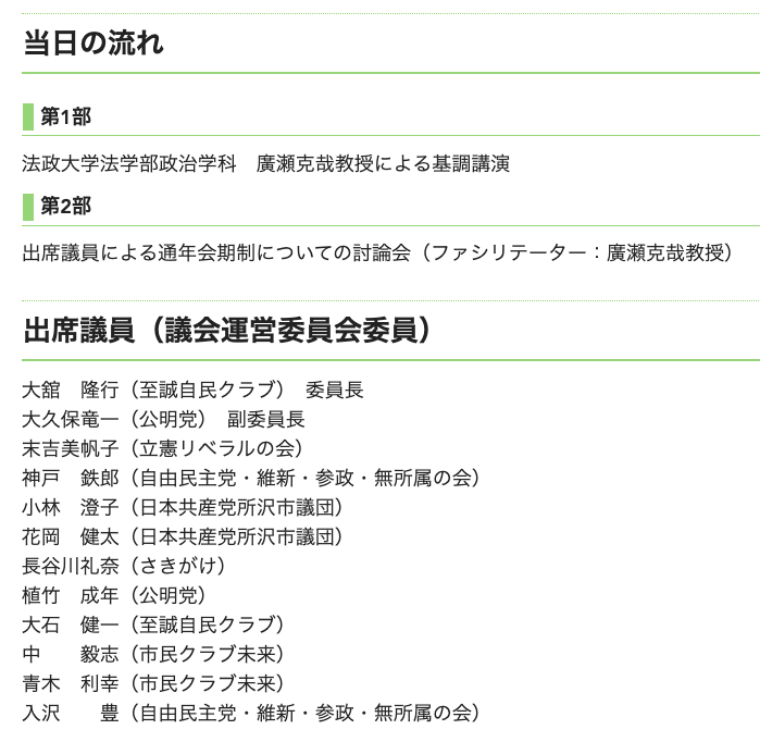 現在全国で増加つつある議会の通年会期制(通年議会)。私はかねてから災害時の即応体制構築や市民と議会の交流機会確保のためにぜひとも導入すべきと呼びかけてきましたが、現在でも志木市議会にはなんの動きもないようです(別項『動画:【志木市議会】年収620万で8ヶ月休みってホント?』参照) - 公聴会・議会報告会・市民議会