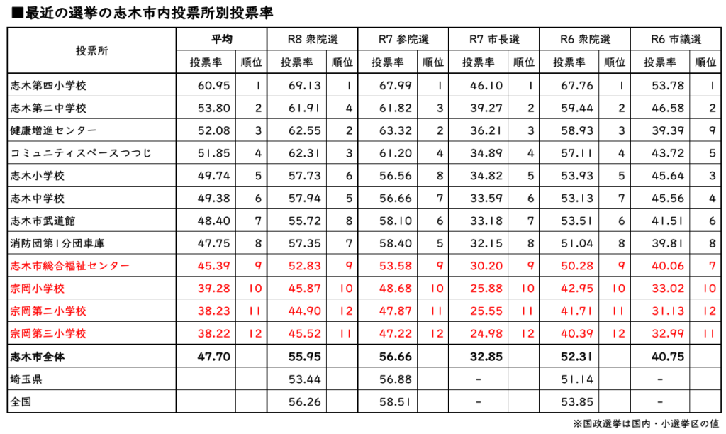 2026年2月8日に衆院選が行われました。志木市全体の投票率は55.95%と全国の56.26%を若干下回りましたが、やはり宗岡地域の4投票所の投票率がとても低いです。下位3投票所はいずれも40%台で市の平均より10ポイント以上低くなっています