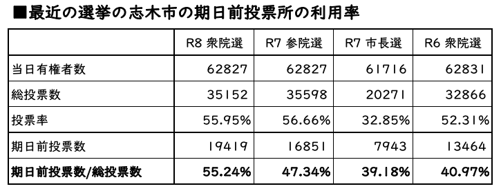 期日前投票の利用者は全国的にも増加していると報じられていますが、志木市では今回の選挙でついに総投票数にしめる期日前投票数の割合が55%を超えました。これは選挙に行った人の半分以上が期日前投票を利用しているということですが、ここでも宗岡地域への不均衡がみられます
